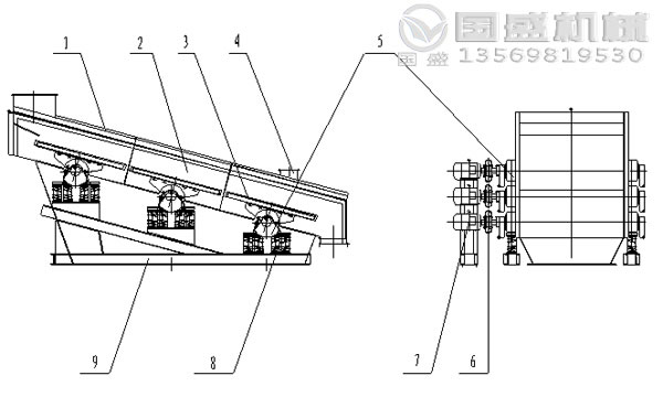 產(chǎn)品結(jié)構(gòu) ![]() 1.密封罩 2.篩箱 3.篩板 4.除塵口 5.激振器 6.軟連接裝置 7.電動(dòng)機(jī) 8.減振彈簧 9.底托
